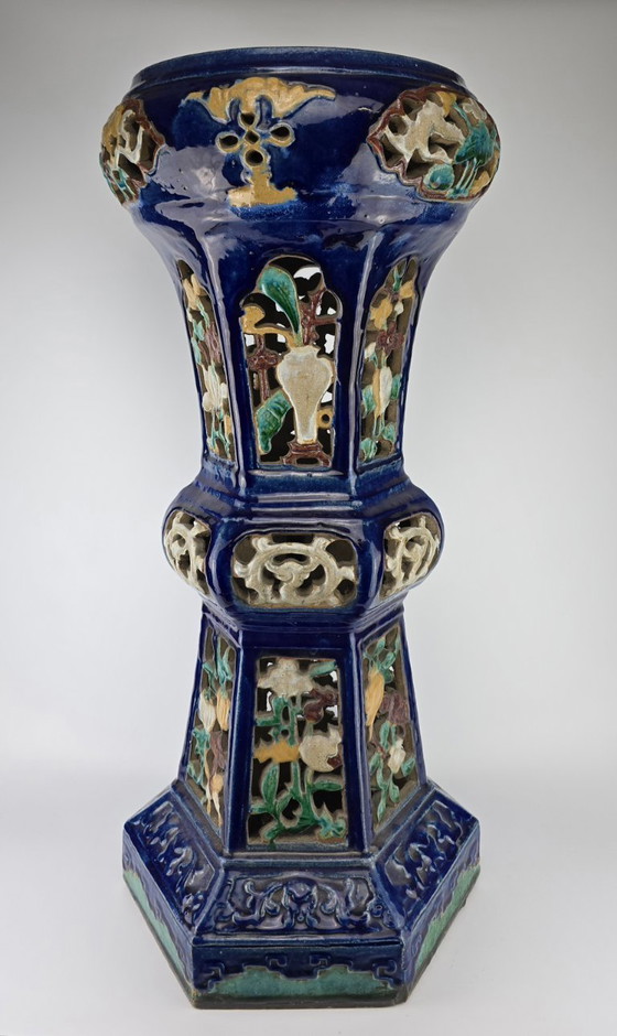 Forma hexagonal con paneles calados decorados con jarrones, flores y enredaderas de hojas en vibrantes esmaltes turquesa, amarillo, verde y berenjena sobre un fondo azul cobalto intenso.