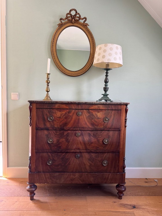 Antigua cómoda de caoba del siglo XIX con tapa pintada con efecto mármol, herrajes de cobre/latón.