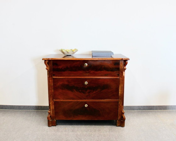 Una exquisita cómoda antigua, elaborada en madera de caoba. Su profundo color marrón irradia calidez y sofisticación. Este mueble es el complemento perfecto para cualquier interior. Sus intrincados detalles y su robusta construcción atestiguan su calidad y encanto perdurables.