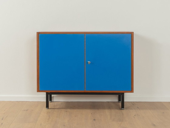 Cómoda clásica de los años 60. Cuerpo en chapa de teca con dos puertas, un estante y patas cuadradas de acero negro. Las puertas están recubiertas de Formica azul. Fabricada en Alemania por DeWe (marca en el cuerpo). En buen estado de restauración, con leves signos de uso.