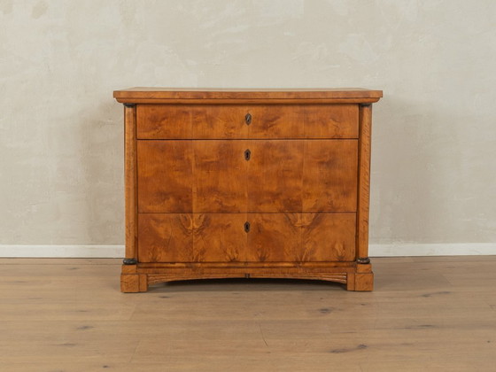 Cómoda Biedermeier clásica de la década de 1830. Estructura de alta calidad en chapa de haya con tres cajones y base típica de la época.