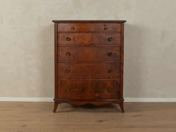 Magnífica cómoda de los años 20. Estructura de alta calidad en haya teñida oscura, con seis cajones y patas típicas de la época. Fabricada en Alemania. Buen estado, con leves signos de uso.