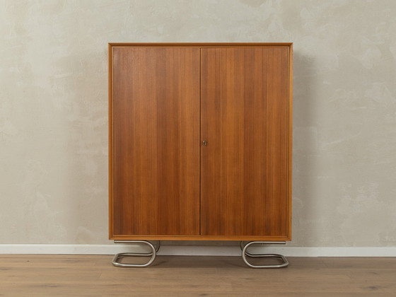 Cómoda clásica de los años 60. Cuerpo de chapa de nogal con dos puertas, tres estantes y patas nuevas de acero inoxidable de diseño Bauhaus. Fabricada en Alemania. Fabricante: Heinrich Riestenpatt.