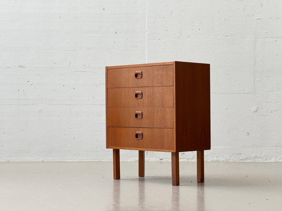 Una cómoda compacta de estilo moderno de mediados de siglo, con el diseño limpio y funcional de los años 60, acabada en chapa de teca cálida. El cuerpo descansa elegantemente sobre patas cuadradas ligeramente inclinadas, lo que le confiere una apariencia ligera y etérea. Los cuatro cajones, de proporciones uniformes, cuentan con tiradores empotrados integrados que se mimetizan armoniosamente con el frontal y realzan el diseño minimalista. La hermosa veta uniforme de la teca le otorga a la pieza un aspecto sereno y sofisticado, mientras que los finos cantos y las uniones con acabado impecable delatan una sólida artesanía. Típica de la producción en serie escandinava de esta época, la combinación de líneas limpias y funcionalidad práctica la convierte en una pieza ideal como cómoda pequeña, mesita de noche o elegante mueble de almacenamiento, tanto para interiores modernos como clásicos.