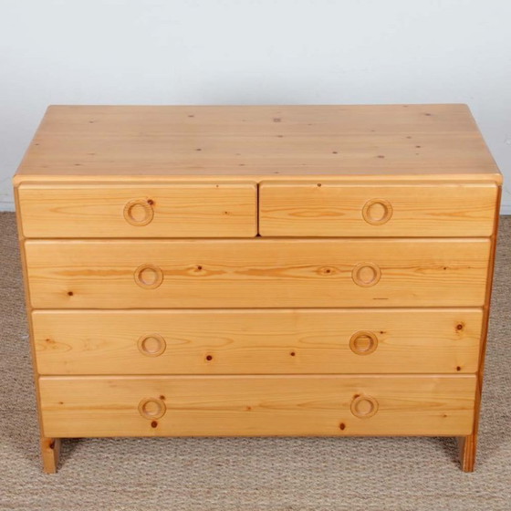 Esta cómoda de pino macizo data de la década de 1960. Fue seleccionada por Charlotte Perriand para amueblar la estación de esquí de Les Arcs. Cuenta con varios cajones que ofrecen amplio espacio de almacenamiento. Se encuentra en buen estado vintage, con una hermosa pátina de madera natural.