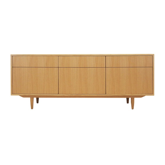 La cómoda se fabricó en estilo escandinavo. La estructura está revestida con chapa de roble. Las patas son de madera maciza. Superficie tras la restauración. En el interior, se han incorporado tres amplios cajones y tres estantes ajustables. El mueble cuenta con una práctica apertura de puertas, que permite un acceso ilimitado a su interior. Estado: Superficie del mueble tras la restauración. Se aprecian pequeños arañazos y defectos de la chapa restaurada. Las marcas de uso más importantes se muestran siempre en las fotos. Producto listo para usar. *Por razones de seguridad, se pueden desatornillar las patas del mueble para su transporte, así como quitar las puertas y los estantes. El montaje no debería suponer ningún problema. En caso de duda, contáctenos y le enviaremos un vídeo instructivo. Datos técnicos: Alto: 70 cm Ancho: 180 cm Fondo: 45 cm