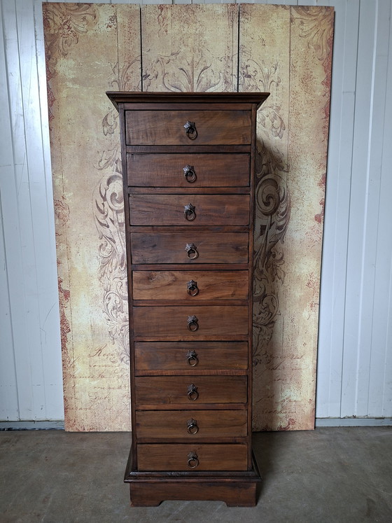Cómoda de teca, botiquín, archivador, dimensiones: 47 x 42 cm y 135 cm de alto.