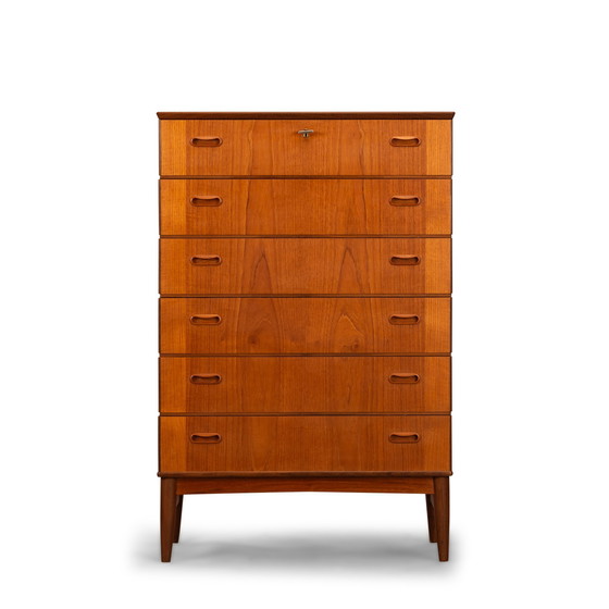 Cómoda de teca. Una hermosa cómoda de teca. Su color es un hermoso marrón rojizo. Los elegantes tiradores y el diseño de la madera la convierten en un verdadero punto de atracción. Esta cómoda alta se encuentra en muy buen estado vintage. Diseño danés. Esta cómoda alta de diseño danés captura la esencia del diseño moderno de mediados de siglo con sus líneas limpias, su forma minimalista y su atención al detalle. Su tamaño compacto la convierte en la opción ideal para dormitorios, salas de estar o cualquier espacio donde se necesite almacenamiento sin renunciar al estilo. Sumérgete en la elegancia del diseño danés y trae el encanto de los años 60 a tu hogar con esta extraordinaria cómoda. Lamentablemente, no pudimos localizar al diseñador ni a la fábrica de muebles. ¡Pero la artesanía es evidente!