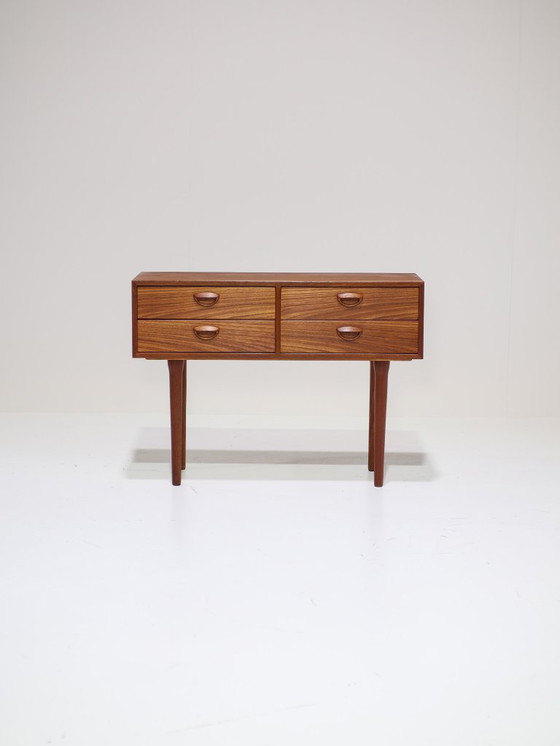 Preciosa cómoda doble diseñada por Kai Kristiansen en Dinamarca en la década de 1960. Esta cómoda está elaborada en teca de cálida calidad con una hermosa veta. Los tiradores de madera son muy refinados y elegantes. Una pieza excepcional con las patas altas originales, ligeramente ensanchadas en la parte superior. Una hermosa pieza ideal como mueble de recibidor o mueble de TV, entre otras cosas.