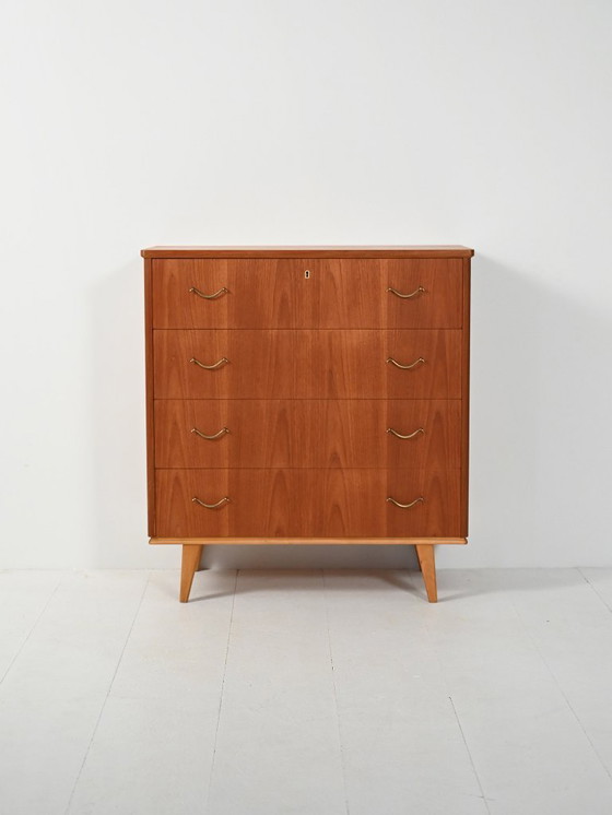 La cálida veta de la teca y las líneas limpias capturan el espíritu nórdico moderno de los años 50. Su cuerpo compacto se realza gracias a una base de roble en contraste y patas cónicas, mientras que los tiradores de latón aportan un toque brillante y decorativo. Cuatro cajones bien proporcionados crean una silueta sobria y equilibrada con la serena elegancia típica del diseño escandinavo de mediados de siglo.