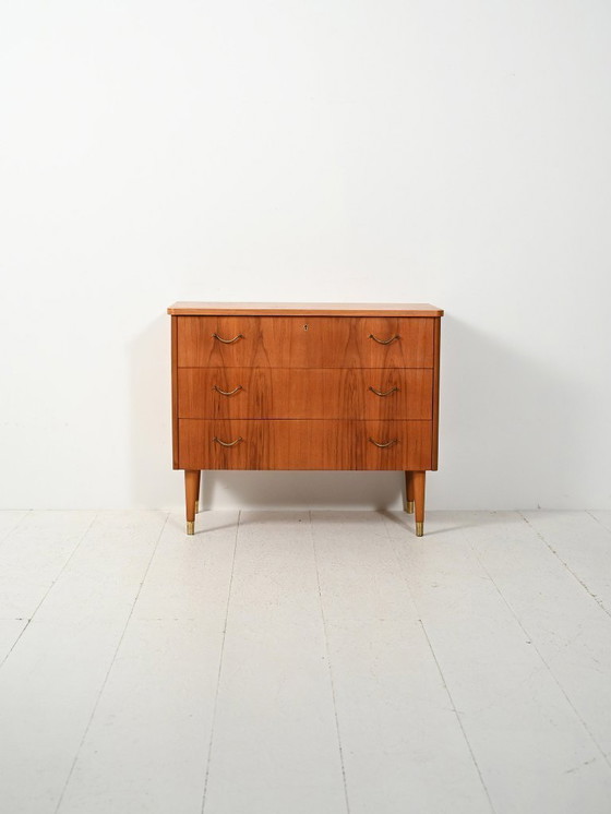 Mueble de teca de tres cajones con veta flameada, tiradores y casquillos de latón: líneas limpias con un discreto toque Art Déco.