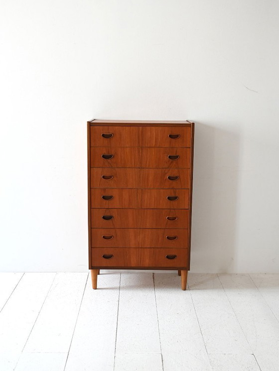 Original cómoda escandinava de los años 50/60 fabricada en madera de teca, con siete cajones y tiradores esculpidos de forma orgánica. Las patas son de roble macizo, afiladas y ligeramente cónicas. Probablemente de producción danesa, como sugiere la etiqueta interior parcialmente visible. El diseño limpio y las ricas vetas de la madera expresan la estética nórdica de la época.