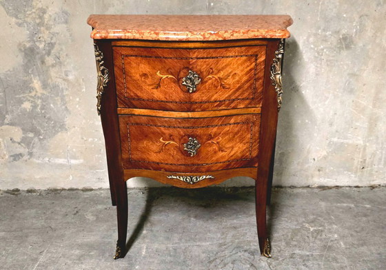 Pequeña cómoda estilo Luis XV, principios del siglo XX, en marquetería de palisandro. Mármol rosa veteado. Muy buen estado, ligeras huellas de uso, falta una pequeña pieza en la parte inferior de la tapa de mármol, no visible desde arriba. Dimensiones: ancho 73 x alto 82 x fondo 40 cm.