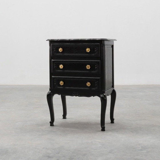 Una sofisticada cómoda de estilo Luis XV, procedente de Francia, circa 1950, elaborada en roble macizo y recientemente restaurada con una elegante laca negra profunda. La pieza cuenta con tres cajones adornados con refinados tiradores de latón dorado y sutiles detalles tallados, que realzan las líneas gráciles y las curvas clásicas de la tradición Luis XV.