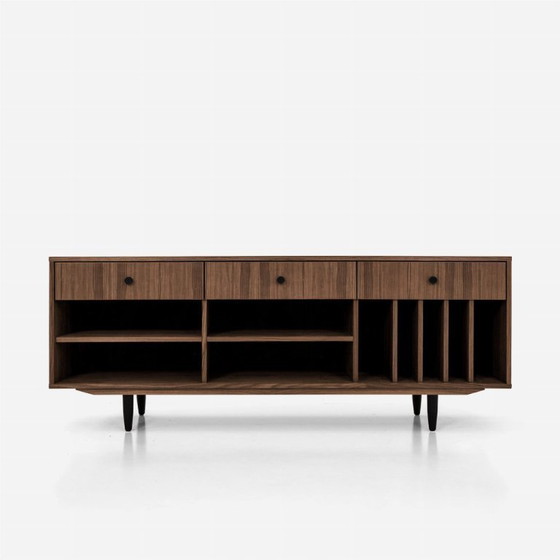 Los estantes inferiores son deslizables, lo que significa que su sistema de montaje es invisible. Lo mismo ocurre con los compartimentos laterales. Puede colocar sus discos de vinilo favoritos en ellos y, gracias a su ajuste, se adaptan fácilmente a sus necesidades.