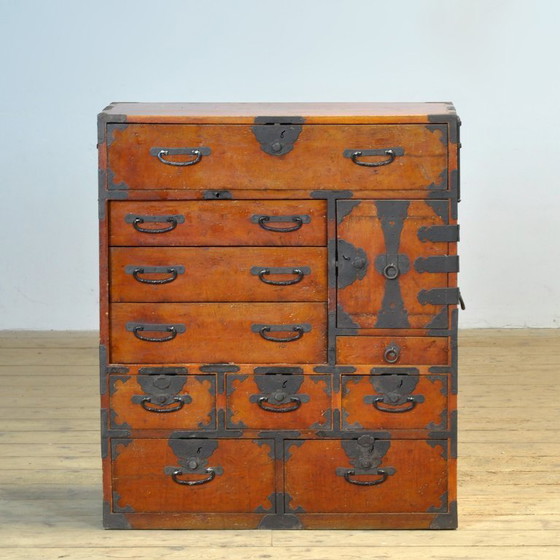 Cómoda tradicional japonesa Tansu de la década de 1890. Fabricada a finales de la era Meiji (1868-1912), esta pieza irradia autenticidad y carácter. Su aspecto cálido y envejecido ha resistido el paso del tiempo. Los robustos herrajes de hierro con cerraduras clásicas realzan la artesanía tradicional.
