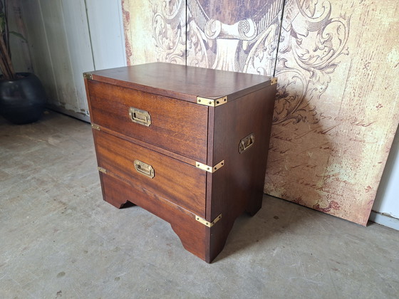 Descubra el encanto de esta cómoda militar clásica, perfecta como boticario o mesilla de noche. Con su rica madera marrón y sus elegantes detalles en latón, esta pieza añade un toque de elegancia atemporal a cualquier habitación.