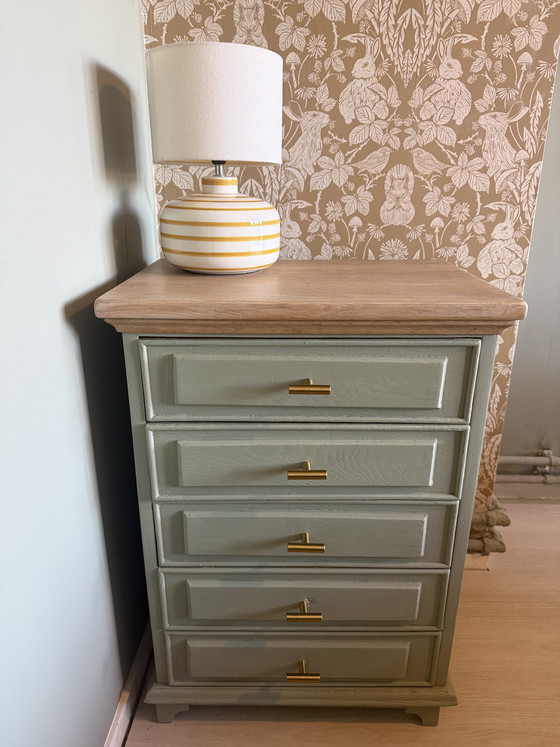 Cómoda pequeña, elegante y con mucho carácter, con un acabado contemporáneo de alta calidad. Este mueble está cuidadosamente pintado en un suave y relajante tono verde y combinado con una cálida tapa de madera. Los sutiles tiradores dorados le dan un aspecto lujoso y atemporal.