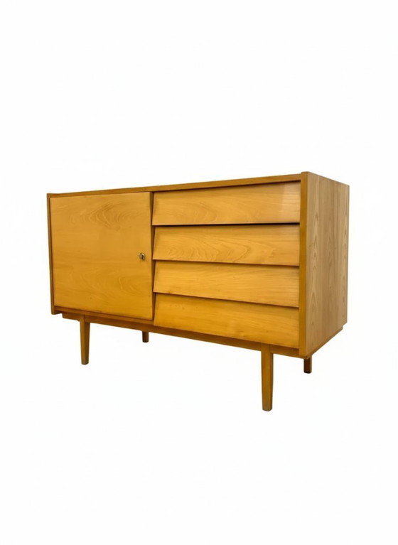 Esta elegante cómoda retro, fabricada en la República Socialista Checoslovaca en la década de 1960 por Interier Prague, presenta un cuerpo de madera maciza chapada con cuatro cajones, puertas con estantes interiores y elegantes patas. La pieza se encuentra en muy buen estado original de época, con pequeños arañazos superficiales propios de su antigüedad. La puerta se cierra mediante un imán, ya que la cerradura no funciona, lo que la convierte en una práctica pieza de almacenamiento lista para su uso inmediato.