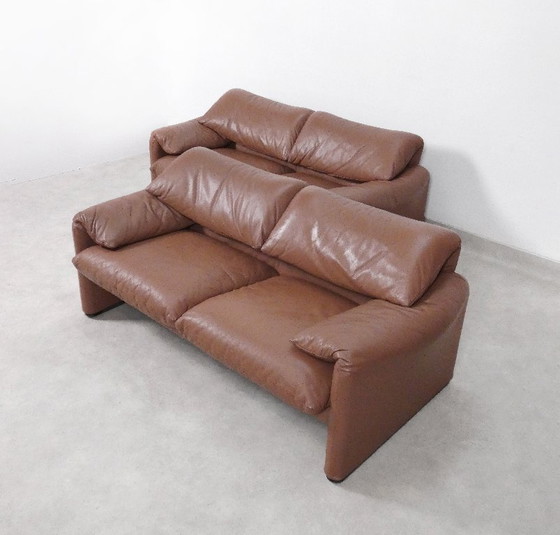 Dos preciosos sofás Cassina Maralunga de 2 plazas con su tapizado original de cuero color moca de alta calidad, diseñados por Vico Magistretti para la marca italiana Cassina.