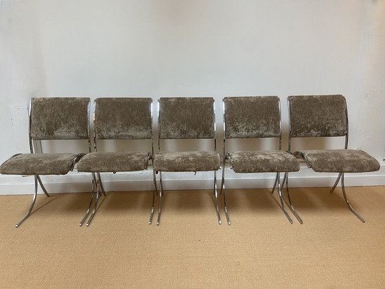 Juego de cinco sillas cromadas de Boris Tabacoff para Maison Jansen, de la década de 1970. Tapizado en terciopelo beige. Sillas de alta calidad. Buen estado general.