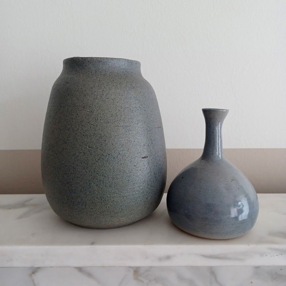 Pareja de cerámicas hechas a mano. Conjunto único. Con una paleta de colores neutros pero cálidos, en tonos grises, azules y arena. El jarrón pequeño con forma de bulbo está esmaltado y se fabricó en 1987. (Alto: 12 cm x Ancho: 9 cm) El jarrón más grande tiene la misma paleta de colores, cálidos pero neutros. El esmaltado tiene un acabado satinado/mate y forma parte de una edición única de cuatro. (Alto: 16 cm x Ancho: 13 cm x Diámetro de la abertura: 7 cm) Hermoso y llamativo conjunto gracias a su diseño minimalista.