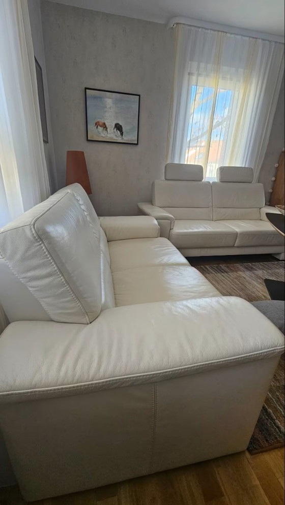 ¡Ponte cómodo con este elegante conjunto de sofás de cuero de Musterring! Estos dos sofás en un elegante color blanco aportan un toque de lujo a tu salón y te invitan a relajarte.