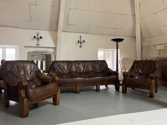 Conjunto de sofá y 2 sillones de los años 60 en madera y cuero