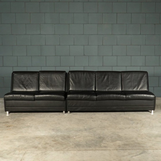 Este robusto y extremadamente cómodo conjunto, compuesto por un sofá de tres plazas y uno de dos, proviene de Alemania y data de la década de 1960. Los sofás de cuero negro descansan sobre patas cromadas minimalistas y cuentan con gruesos cojines que ofrecen una excelente comodidad. Los respaldos de los sofás presentan un hermoso acabado con una tela negra que se integra a la perfección con el cuero. Este atractivo acabado permite que los sofás se ubiquen libremente en cualquier habitación. Las líneas limpias y la tapicería de cuero negro crean un hermoso diseño y una apariencia refinada y elegante para estas llamativas piezas. Los sofás están en excelentes condiciones, con solo leves signos de desgaste.