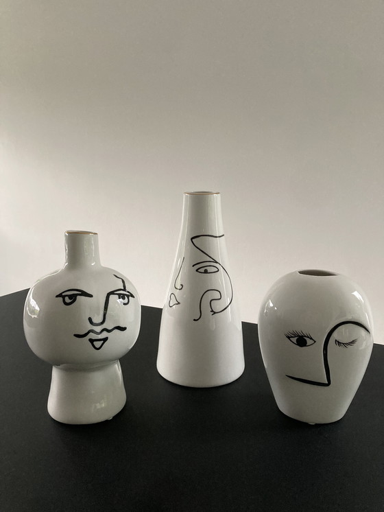 Conjunto de tres jarrones decorativos de Palladier. Tres jarrones, cada uno decorado con una representación diferente de un rostro estilizado. Dos jarrones presentan un sutil borde dorado alrededor del cuello, mientras que el tercero (el más pequeño) presenta un rostro en relieve. Este jarrón más pequeño también presenta una pequeña muesca en el borde inferior, invisible cuando está de pie. Altura del jarrón más grande: 26 cm. Altura del jarrón mediano: 23 cm. Altura del jarrón más pequeño: 18 cm.