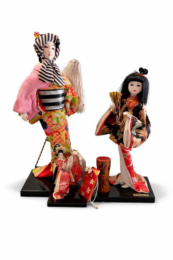 Conjunto de tres muñecas decorativas tradicionales japonesas, elaboradas a mano entre las décadas de 1960 y 1970, inspiradas en los estilos y costumbres del período Edo (1603-1868). Miden 38, 33 y 10 cm de altura, respectivamente, y están montadas sobre una base de madera.