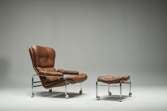 Conjunto de tumbona y otomana suecas en cromo y cuero marrón de Scapa Rydaholm, años 60