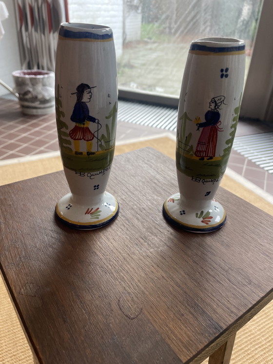 Sumérgete en el mundo de la elegancia francesa con este exquisito juego HB Quimper, una representación perfecta del arte tradicional bretón. Cada jarrón es un testimonio del rico patrimonio cultural de la cerámica de Quimper, con figuras bretonas pintadas a mano que aportan un toque de encanto vintage a cualquier ambiente. Sus vibrantes tonos y sus intrincados diseños cautivarán e inspirarán, convirtiendo estos jarrones en una encantadora adición a cualquier colección.