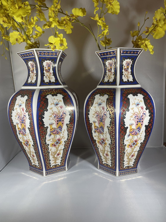 Este exquisito par de jarrones irradia una elegancia atemporal, ideal para realzar cualquier interior sofisticado. Sus intrincados diseños y vibrantes colores invitan a la admiración, convirtiéndolos en una pieza central impactante para cualquier estancia. B&G Italia