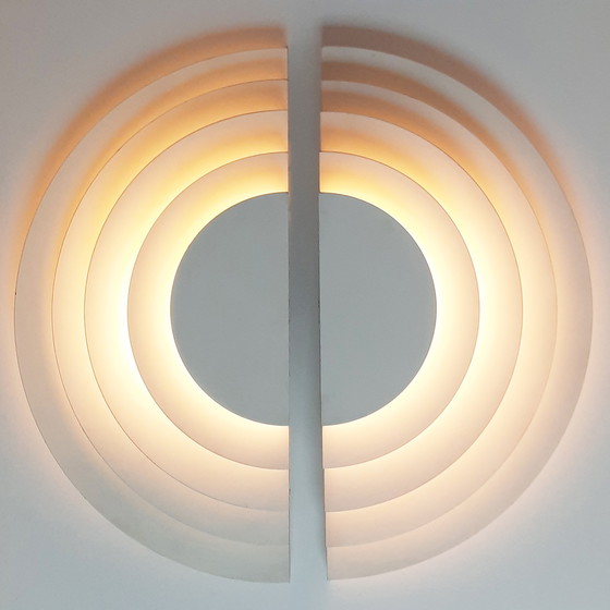 Juego de lámparas de pared Raak Amsterdam "Meander" - Modelo C-1515. Este excepcional juego de lámparas de pared Raak Amsterdam "Meander" (modelo C-1515) es una verdadera atracción para los amantes del diseño. Sus característicos relieves circulares y concéntricos crean un sutil y elegante juego de luz en la pared, como reza la descripción original: "Como un disco dorado, el sol se hunde en el mar del espacio...". Estas lámparas, diseñadas por los diseñadores italianos Cesare Casati y Emanuele Ponzio, combinan a la perfección funcionalidad y arte. Los arcos han sido repintados en su color original, lo que les confiere un aire completamente renovado. El juego incluye los soportes de pared originales, listos para su instalación inmediata. Para los puristas, también dispongo de un juego vintage en su estado original, sin restaurar. Características: Modelo: C-1515. Dimensiones: Diámetro 25 cm, altura 10 cm. Apto para bombillas de hasta 100 W. Material: Metal blanco pulido. Diseño atemporal que se integra tanto en interiores modernos como vintage. Acerca de Raak Amsterdam: Raak Amsterdam fue un reconocido fabricante de iluminación neerlandés, fundado en 1954 por Carel O. Lockhorn. La empresa se hizo conocida por sus diseños innovadores y minimalistas que encarnaban la estética del "diseño holandés" de mediados del siglo XX. Raak colaboró con diseñadores de renombre como Bertjan Pot, Nanny Still y Nico Kooy. Sus luminarias eran conocidas por su excepcional calidad y sus diseños distintivos, a menudo con líneas limpias, formas geométricas y un uso innovador de los materiales. La empresa cerró a finales de los 90, pero sus piezas siguen siendo muy codiciadas en todo el mundo por coleccionistas y entusiastas del diseño moderno de mediados de siglo.