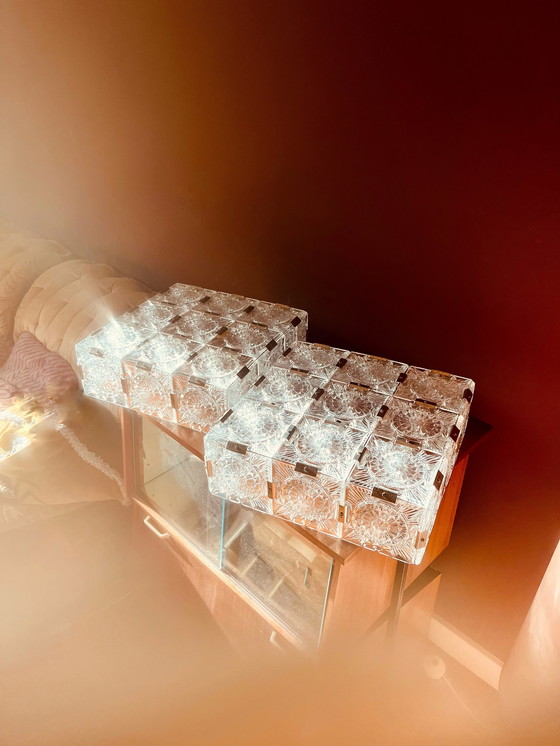💡Kamenicky Senov💡 Un conjunto de lámparas de lujo único de la República Checa, atribuido al gran diseñador Kamenický Šenov. 💫Este conjunto de los años 60 se caracteriza principalmente por sus lámparas de cristal cuadrado combinadas con metal plateado. Gracias a la elaboración del cristal, ofrecen un hermoso destello de luz con un efecto cálido. Estas lámparas se pueden adquirir por separado o juntas como un conjunto único. Lámpara de techo cuadrada (2 piezas): Al: 15 An: 40 Lámparas de pared (2 piezas): Al: 28 An: 12 Lámpara colgante (1 pieza): Al: 27 An: 15