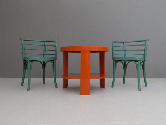 Este excepcional conjunto Thonet, compuesto por dos sillones B 246 y una mesa de centro T 142, ofrece una vívida visión del carácter expresivo del diseño de muebles modernista temprano. Atribuido a Josef Frank, el conjunto captura su característico equilibrio entre geometría funcional y color inesperado: modernismo suavizado por la intuición arquitectónica. Fabricadas en la década de 1930 por Thonet, las sillas B 246 (etiquetadas) presentan respaldos bajos de listones horizontales y estructuras de madera curvada elegantemente arqueadas, que combinan ritmo visual con modestia ergonómica. La mesa T 142, con un intenso acabado de laca rojo anaranjado, evoca la integridad escultórica de la obra de Frank con su amplio tablero y su base cilíndrica. El conjunto se conserva en buen estado original, con algunos signos del paso del tiempo: arañazos en la laca, decoloración ocasional, especialmente en los reposabrazos, y una pátina que habla de su autenticidad. Estos no son defectos, sino parte de la narrativa del objeto. Estructura sólida. Históricamente, este modelo se encontraba entre los instalados en la icónica Villa Rezek de Viena, construida en 1933, un proyecto que desafió la esterilidad del modernismo con una visión vibrante y humanista. Este conjunto encarna ese legado. Ideal para interiores que valoran tanto la forma escultural como el carácter histórico. Una declaración de diseño audaz y documentada, con pátina y presencia. Estado: Buen estado original. Presenta rayones superficiales y decoloración en los reposabrazos. Estructura sólida e históricamente significativa. Dimensiones: Sillas: Alto 67 cm, Ancho 55 cm, Fondo 55 cm. Mesa: Alto 60 cm, Diámetro 68 cm.