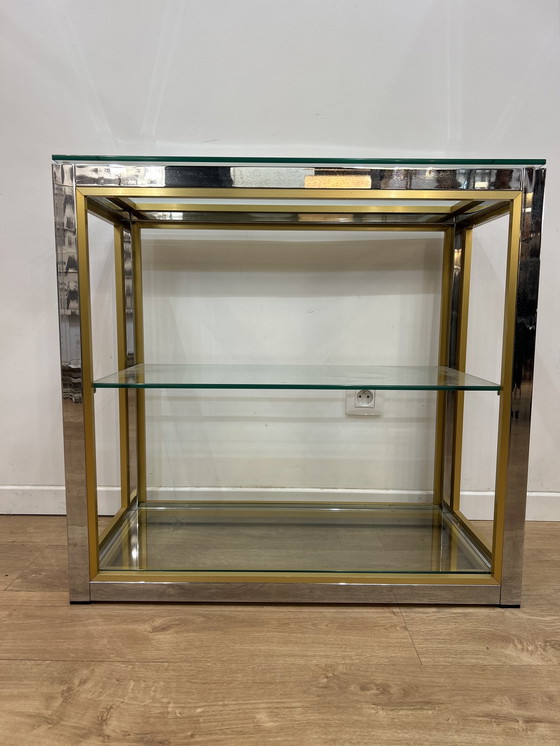 Consola de cristal y metal, diseñada por Renato Zevi, años 70, estilo Regencia. Buen estado.