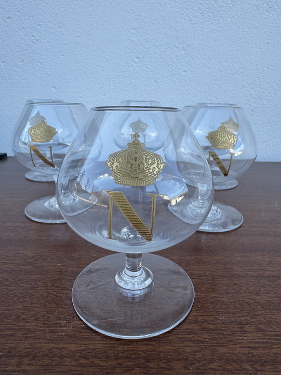 Juego de 6 copas de licor antiguas de cristal Baccarat (selladas) y grabadas en oro con la "N" de Napoleón; en muy buen estado general (una presenta pequeños desconchones en el borde).
