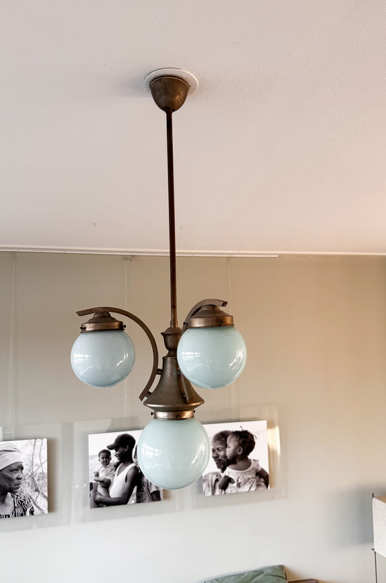 Elegancia atemporal con esta lámpara de araña Art Déco de 1930, con impresionantes globos de cristal azul. Su estructura de latón le aporta un toque de encanto vintage, convirtiéndola en la pieza central perfecta para cualquier habitación.