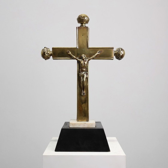 La cruz, revestida de metal dorado, presenta una figura de Cristo finamente fundida, plasmada con un naturalismo expresivo y una serena reverencia. Cada extremo de la cruz está adornado con esferas decorativas, sutilmente repujadas con motivos florales, que le confieren un carácter de ornamentación sagrada. La composición escultórica se realza con su posterior base de mármol negro y piedra blanca, que acentúa su presencia arquitectónica y su elegancia ceremonial.