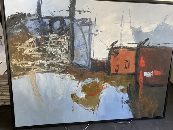 Esta pintura abstracta presenta una composición dinámica con una mezcla de tonos azules, marrones, grises y naranjas. Está impresa en lienzo y ofrece una estética moderna y expresiva. Su estilo abstracto la convierte en una pieza versátil que se adapta a diversos diseños de interiores. La pintura se encuentra en buen estado, lista para realzar su espacio vital con su singular estilo artístico.