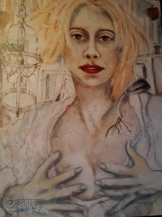 Esta pintura de Birgit Lorenz es una obra de arte fascinante que cautiva con su expresividad y detalle. El retrato representa a una mujer de mirada intensa, enmarcada por colores vibrantes y sutiles detalles que realzan la profundidad y la emoción de la obra. El acabado craquelado añade una dimensión extra, dándole a la pintura un aspecto auténtico y atemporal.