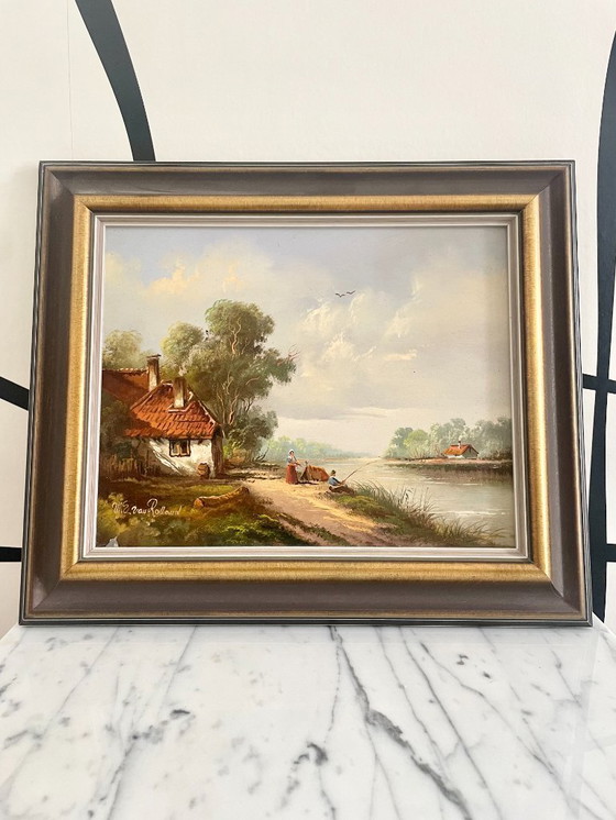 Cuadro de época firmado W.E. van Rolland - Paisaje rural - Óleo sobre tabla - Marco de madera
