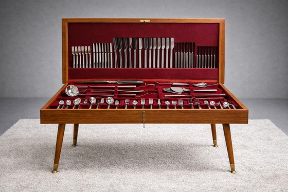 Un mueble para cubiertos de madera maciza con patas y tapa abatible. El interior está completamente forrado en terciopelo rojo y compartimentado para albergar un juego completo de cubiertos de acero inoxidable de 130 piezas con un diseño elegante. Apoyado sobre cuatro patas cónicas rematadas en pies de latón, esta pieza combina funcionalidad y elegancia moderna. Fabricado a mediados del siglo XX, circa 1950-1960, con un estilo modernista y escandinavo.