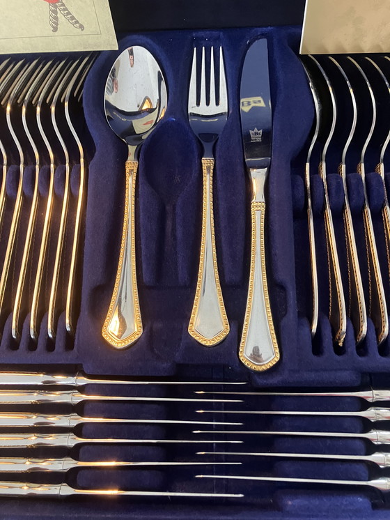Haz que tu experiencia gastronómica sea aún más especial con este hermoso juego de cubiertos de SBS Solingen. Con un elegante borde dorado y un acabado plateado pulido, estos cubiertos añaden un toque de lujo a cualquier comida. Perfecto tanto para el día a día como para ocasiones especiales, este juego es imprescindible para quienes disfrutan de una cena con estilo.