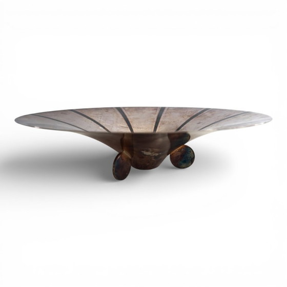 El cuenco escultural de latón plateado, con su forma cónica y rayos oscuros que emanan del centro, irradia una elegancia absoluta en el claro lenguaje de la Bauhaus. El cuenco luce una fantástica pátina y un extraordinario juego de colores en el metal, desarrollado a lo largo de los años. Las patas, formadas como tres discos circulares, le confieren un carácter distintivo de la Bauhaus. El cuenco se encuentra intacto.