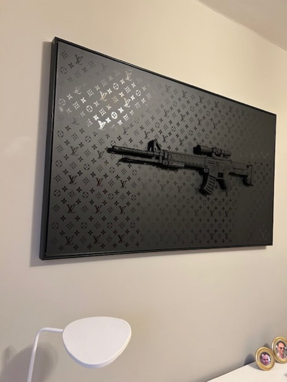 La obra de arte Pistola Negra Louis Vuitton - XXXL (Tamaño natural) de DALUXE ART es una impresionante expresión de estilo y artesanía artística. Con un generoso tamaño de 120x70 cm, este cuadro XXL atrae la atención de inmediato. El borde de madera negra proporciona un marco atemporal, mientras que el centro de plástico negro mate ofrece el telón de fondo perfecto. Llamativo en monograma Louis Vuitton brillante, una réplica de pistola de plástico está cuidadosamente colocada como efecto 3D.