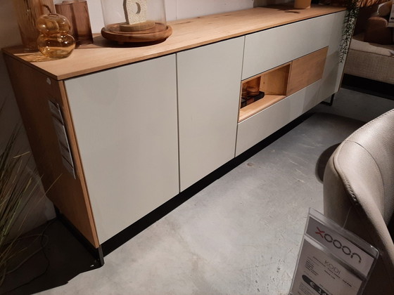 Aparador Darwin de 3 puertas + 3 cajones + 1 nicho – 240 cm (+ LED) de la colección Xooon. Diseño: Cuerpo: chapa de roble natural, frentes: MDF lacado en blanco, patas de metal en negro roto. Material: MDF de roble natural, metal blanco en negro roto. Disponible en varios tamaños; también se puede colocar más bajo utilizando las patas de madera incluidas.