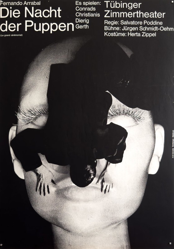 Commissioned for the Tübinger Zimmertheater staging of Die Nacht der Puppen (Arrabal’s Le grand cérémonial), the poster exemplifies Grindler’s grid-led composition and Domberger’s screen-print precision: dense, inky blacks; razor-sharp type; and photographic contrast tuned for maximum theatrical impact. It is both a marketing object and a concise thesis on how postwar German design harnessed photomontage for avant‑garde performance.